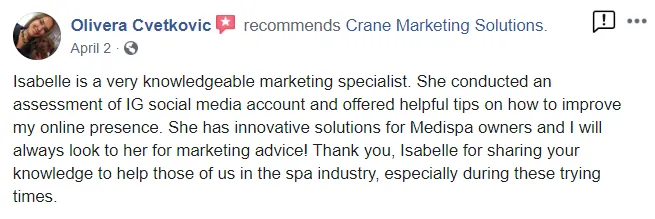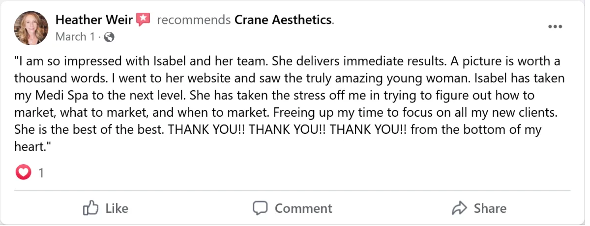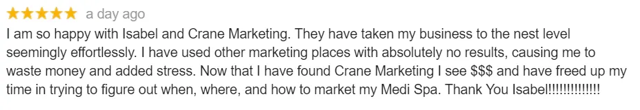 "Finding Isabel and the Crane Aesthetics team was like finding a needle in a haystack... We made over $22k in revenue in our first month!"